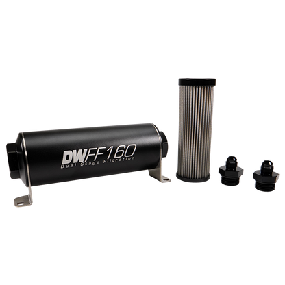 In-line fuel filter element and housing kit, stainless steel 5 micron, -6AN, 160mm. Universal